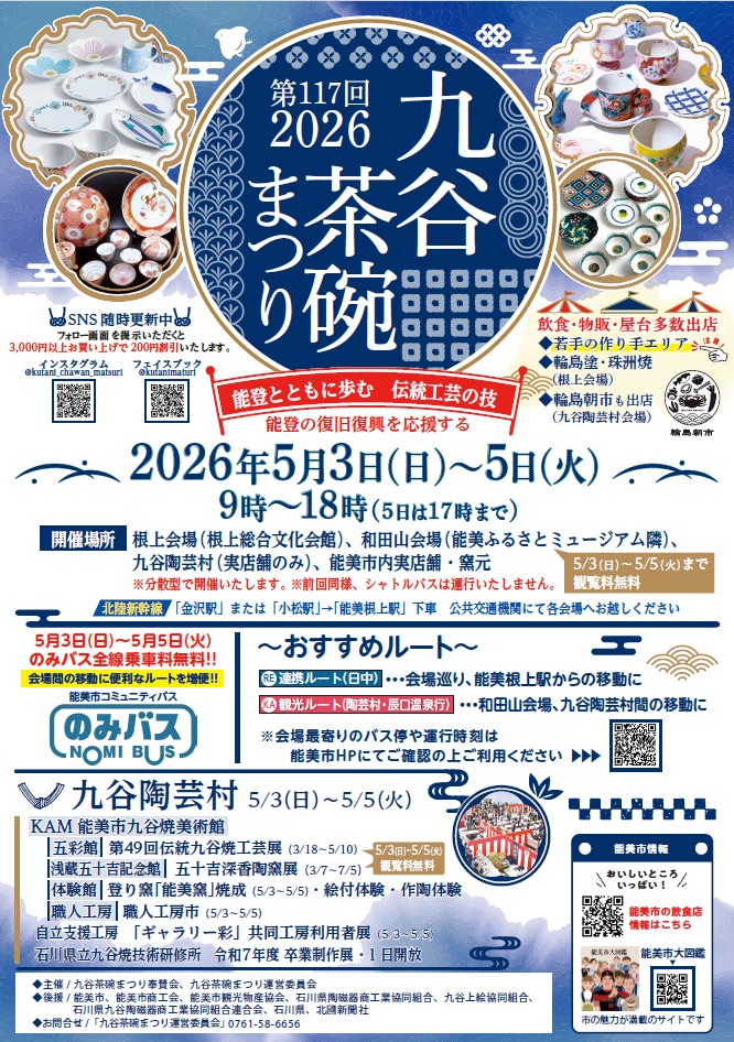 九谷茶碗まつり 2026.04.09 第117回九谷茶碗まつりのチラシが完成しました♪ 開催日時やイベント内容など、ご覧いただけます。 ぜひチェックしてみてください♪ ~皆さまのご来場を 心よりお待ちしております~